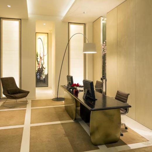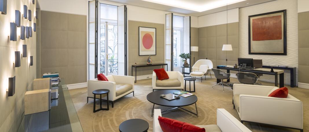Le Parc Monceau et son ambiance bucolique, le siège de la Banque Rothschild et des ambassades à quelques pas, la galerie Lelong et ses œuvres signées par des artistes contemporains qu’on ne présente plus : aucun doute, nous sommes bien au cœur du fameux quartier central des affaires de la capitale. C’est au 30 de l’avenue de Messine que nous avons fait l’acquisition, en 2010, de deux étages d’un immeuble haussmannien de standing, avec l’ambition d’y créer l’un des plus beaux sièges sociaux de Paris pour une holding au cahier des charges très exigeant. Sous la houlette du décorateur Pascal Allaman, les deux espaces ont été reliés par un atrium central : 14 bureaux et open spaces, trois salles de réunion, une cafétéria et une salle de sport y ont été aménagés, le tout avec une hauteur sous plafond monumentale, une décoration et des œuvres d’art pour le plus grand plaisir des visiteurs. Cette rénovation qui n’est pas sans rappeler les prestations des plus grands hôtels de luxe, avec mobilier sur mesure, domotique dernier cri et autres matériaux précieux et (très) haut de gamme. Un projet hors norme pour un client qui l’était tout autant.